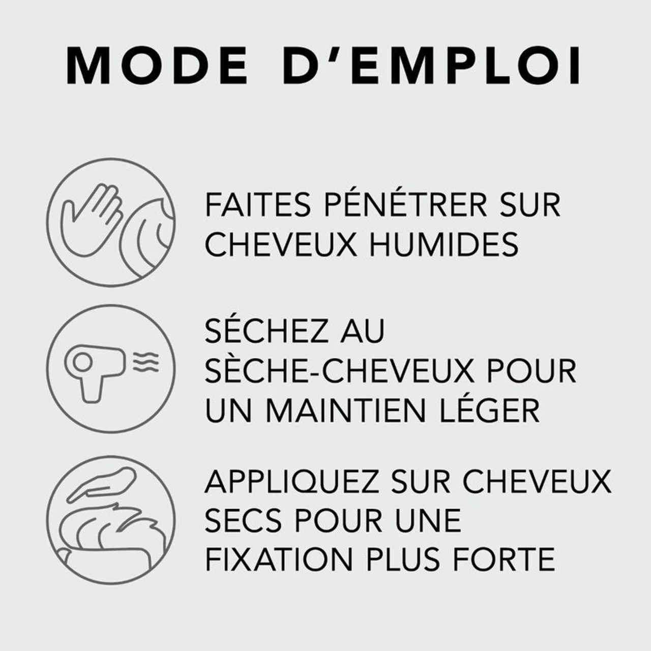 – APPLIQUEZ sur les cheveux secs pour une tenue encore plus forte.