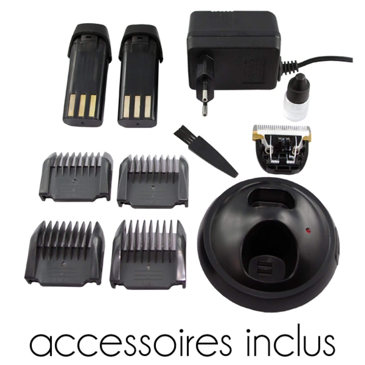 Livré avec chargeur, socle, huile et brosse de nettoyage.